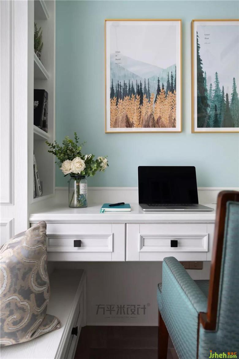 將中庭與空中花園改為更具私密性的獨(dú)立書房,水紋玻璃房門將自然光線引入走廊區(qū)域。房間面積不大,為保證書桌區(qū)域的清爽,將開放式書柜設(shè)置在書桌兩側(cè)。書桌背側(cè)木質(zhì)擋板,便于清潔。L型一體地臺于左側(cè)書柜下方可置物,靠窗一側(cè)則是飄窗形式,可坐可臥。保持空間感的同時又具實用性。