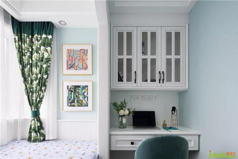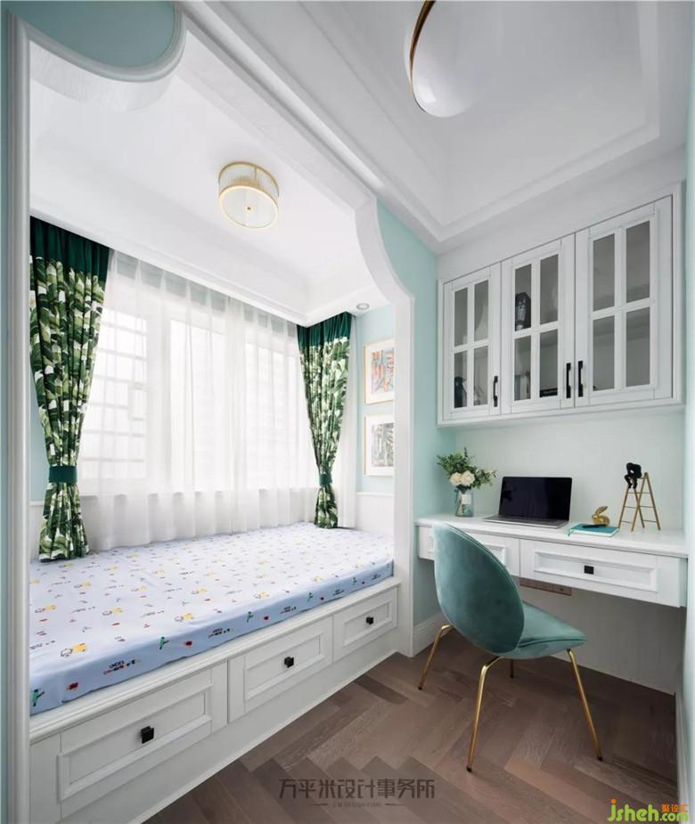 不足六平的兒童房,靠窗一側(cè)是L型采光窗,考慮難以常規(guī)放置成品家具,采用儲物式榻榻米與定制書桌的形式實現(xiàn)幾大功能。床尾一側(cè)為滿墻儲物柜成為收納空間。造型隔墻弧形門洞增加童趣,并讓床鋪區(qū)域略微圍鑲內(nèi)收。于靠床一側(cè)設(shè)置壁燈開關(guān)及安全插座。木質(zhì)護(hù)墻板便于打理。窗簾與掛畫色彩呼應(yīng)。