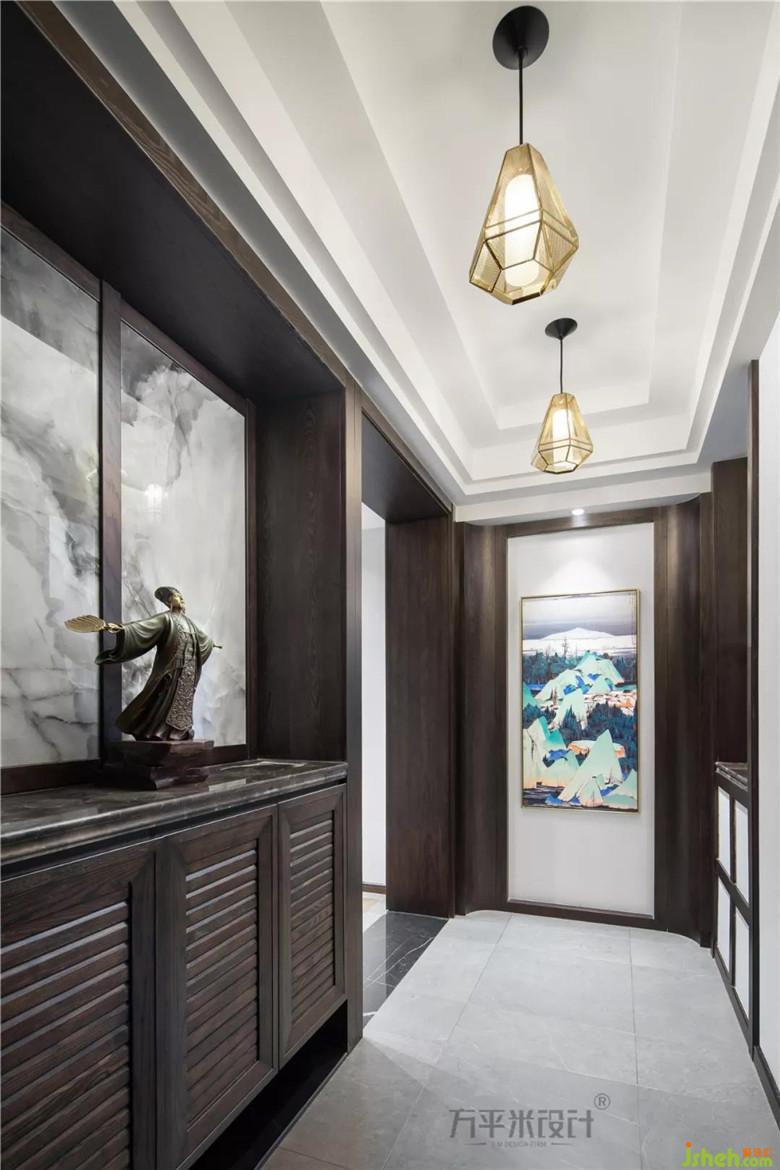 門廳:為避免進門后的空間壓抑感,于鞋柜上方留空,將瓷磚薄板嵌入背板處,光潔質(zhì)感豐富空間的整體氛圍。柜體底部的留空則是便于收納,更為整潔便利。端景處選用有視覺延伸效果的畫作拉長縱向空間感。