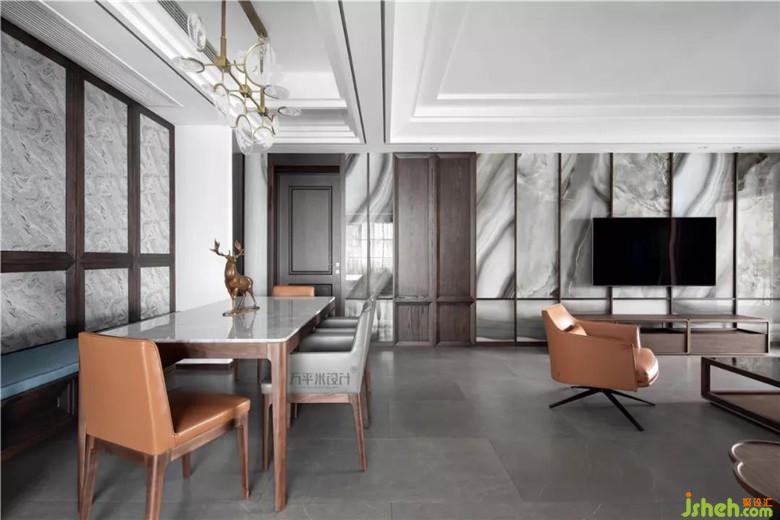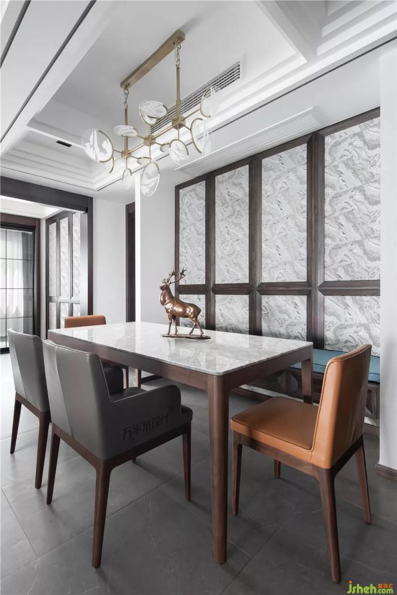 餐桌椅選用線條簡約的設(shè)計,餐臺光潔的雪花白大理石臺面于材質(zhì)及色澤上應(yīng)對墻面的硬裝用材。中廳及餐廳的層次分明,相鄰區(qū)域的對稱卡座互為呼應(yīng)。設(shè)計師特意設(shè)計的原木木框門型及低調(diào)咖色,搭配精選灰調(diào)云紋布樣,富有肌理。
