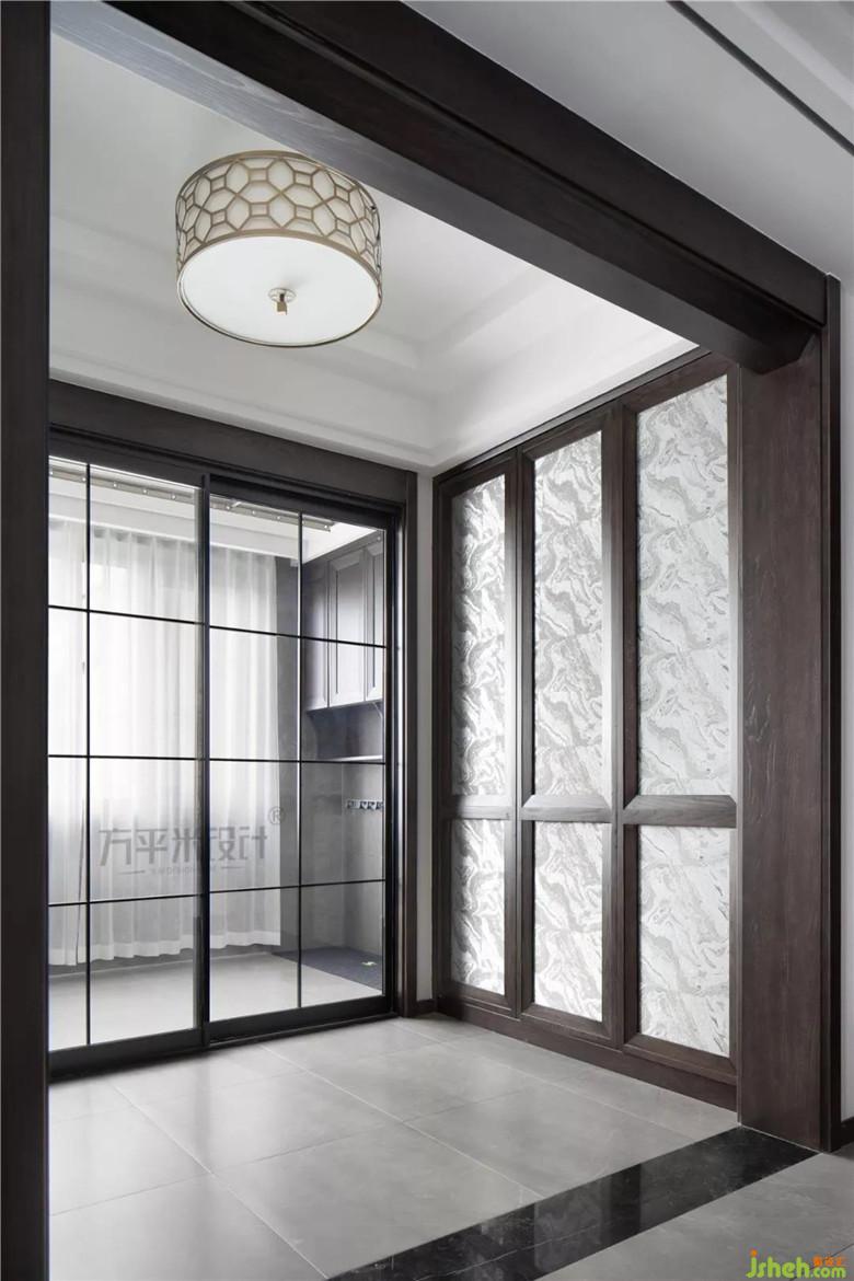 移步中廳則是寬敞的換鞋區(qū)域:有懸空的卡座設(shè)計于兩側(cè)的收納柜中,大背板與門廳處采用相同的紋理瓷片裝飾,光潔便于打理。作為入戶和主要公共起居空間的自然過渡,中廳處所使用的材質(zhì)及門型于全屋均有所呼應(yīng)?!?