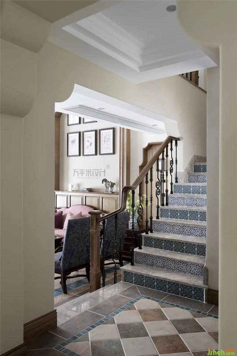 樓梯間綠色波導(dǎo)線和菱形地磚互相襯托,這也是古典美式風(fēng)格的元素代表。一樓除了運(yùn)用布法羅方格花磚的鋪貼之外,樓梯側(cè)板采用了巴洛克花紋地磚,單雙交錯(cuò)穿插的變化,摒棄了一貫樓梯間的呆板樣式。