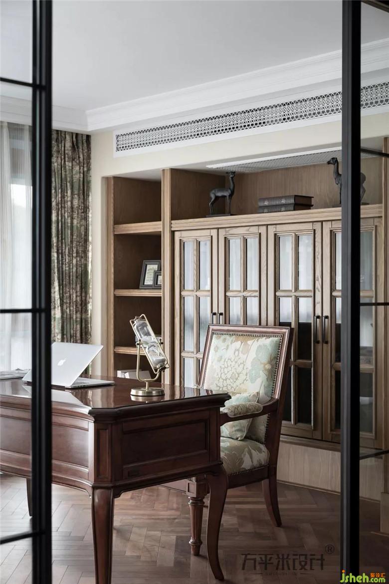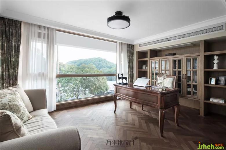 書房單獨設(shè)計在回廊的另一側(cè),是一層茶室上方加蓋樓板所形成。大大的落地窗,視野開闊,可以直接看到西湖公園。迎著晨光和晚風(fēng),這方獨立的空間,靜謐安心,讓人可以帶著平和的思緒在這里學(xué)習(xí)小憩。