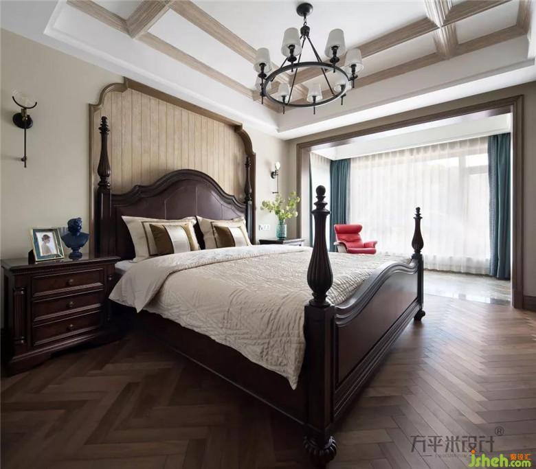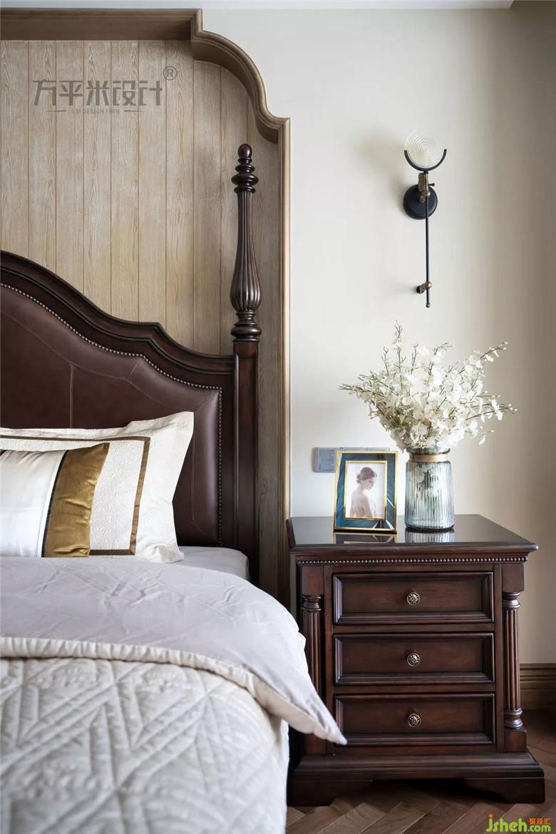 主臥以奶咖色墻漆與內(nèi)凹風(fēng)化白墻板造型結(jié)合,與頂面進行分割,床體嵌入的同時也增添了整體的層次感。主床選用了皮質(zhì)靠背沿以金屬鉚釘扣,搭配經(jīng)典的美式木質(zhì)邊框。床線條勾勒細節(jié),木質(zhì)結(jié)構(gòu)穩(wěn)重舒適,帶著典雅莊重氣質(zhì),加上全房實木地板魚骨拼貼,形成傳統(tǒng)美式復(fù)古的圍合。