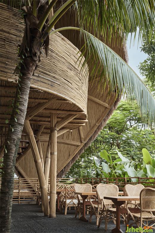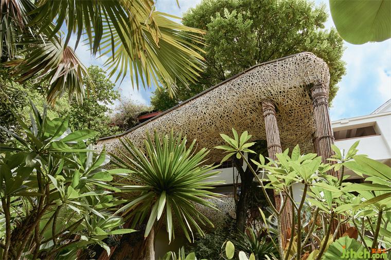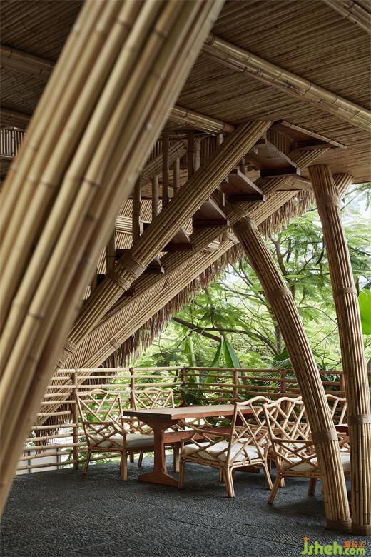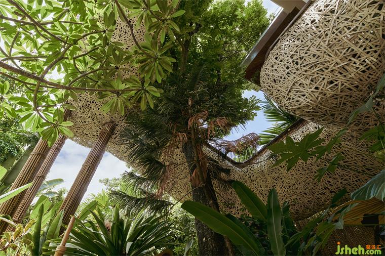 在樓梯外的延伸空間,我們選擇采用版納傳統(tǒng)的竹編古法技藝,會所設(shè)計為這個空間創(chuàng)造了一種與自然深度連接的機(jī)會,仿佛將內(nèi)外世界融為一體。這里不僅有獨(dú)特的觀景體驗,還有自然的治愈力量。
