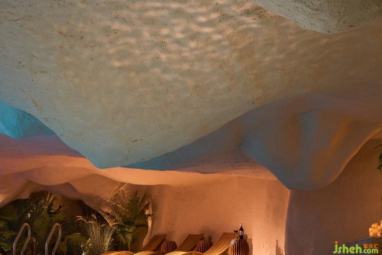 酒店設(shè)計(jì)泳池區(qū)域設(shè)計(jì)靈感源自對(duì)一片神秘地下源泉的發(fā)現(xiàn),暗流涌動(dòng)的地下溫泉傳說會(huì)勾起每一顆因好奇而去探索的心。頂部的曲線與高低起伏,塑造出如天然溶洞一般的壯觀奇景。