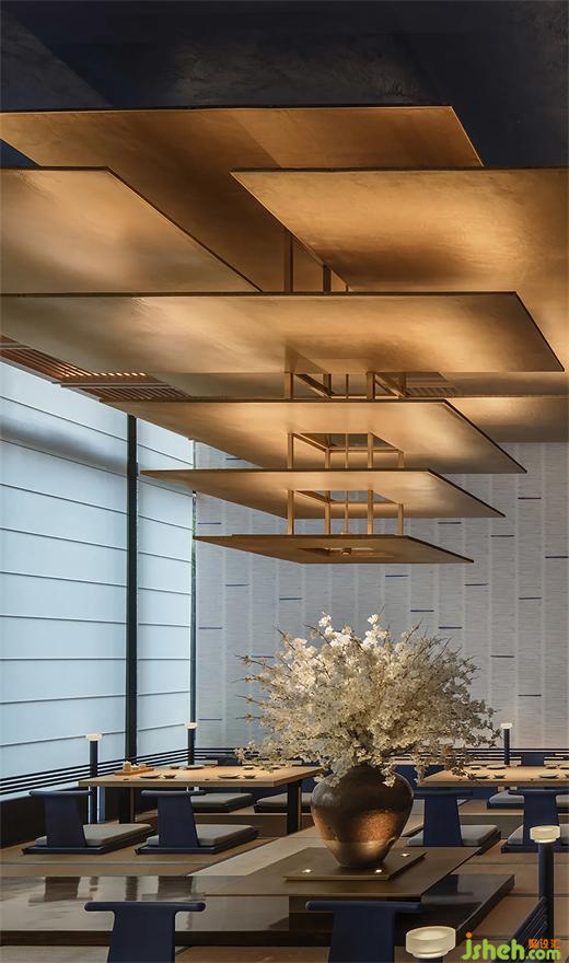 食客穿行至開闊的大堂之處,從天花上懸掛下來的金色裝置映入眼簾,仿佛如初見水中倒映的金閣寺一般。裝置來自京都傳統(tǒng)的鍛金工藝精心制作而成,自然的紋理賦予了其古樸的質(zhì)地,又非一味的文化符號挪用,僅以簡約的線條抽象描摹,強調(diào)出現(xiàn)代性的輪廓感,寥寥數(shù)筆就將這靜謐與遁世離俗的氣質(zhì)渲染,仿佛有來自原野的風、搖曳的枝葉和濕潤苔蘚的氣息都剎那間涌了進來。