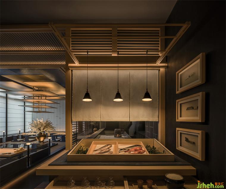 而在與大堂平行并置的另一端明廚空間內(nèi),可近距離欣賞廚師炙烤鰻魚和端爐燒的烹飪過程,與大堂空間中懸掛的藝術(shù)裝置形成了有趣的互文關系——匠人們以火為主要方式淬煉出頂級料理的口感,與浴火再生的金閣寺復現(xiàn)之美,此時此地,發(fā)生碰撞,對話,并盤旋上升,最終得以在整個空間回蕩。