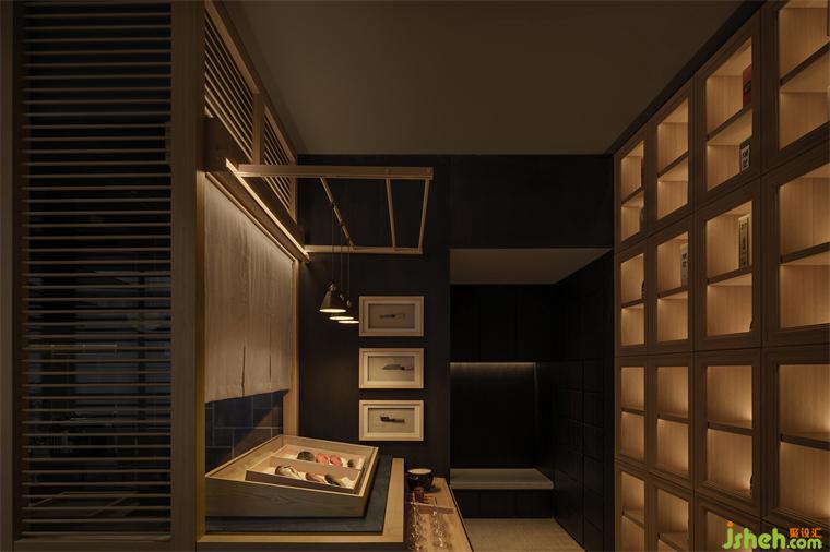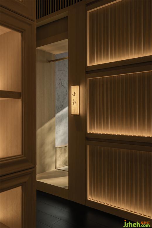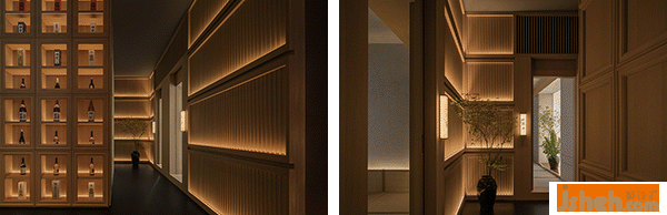 整個空間以京都阡陌交錯的街巷格局為空間參照范本,整體以交通空間為串聯(lián)起或開放或私密的用餐場景,也讓空間有了張弛的節(jié)奏,時而是輕快,時而舒展。走道的寬度被精細的控制到恰好適宜一人自由穿行,二人并肩擁擠的尺度之內(nèi),致敬曖昧模糊的“幽玄”之美。