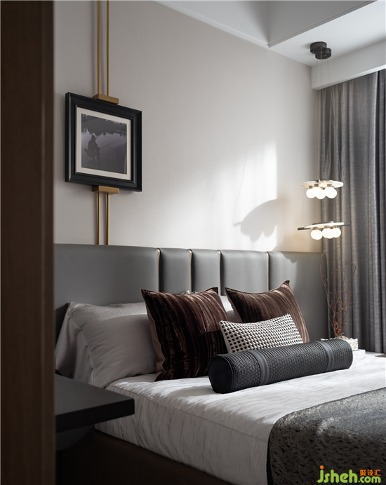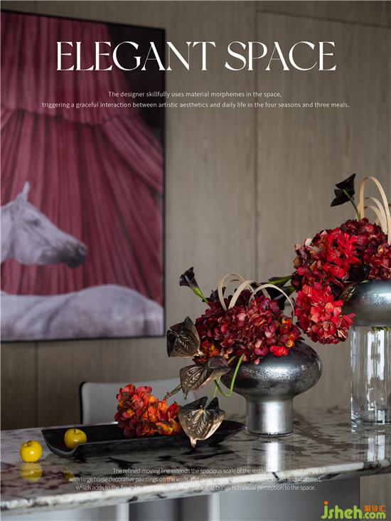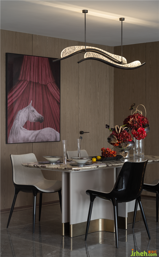 精煉的動線延伸了餐廳的闊綽尺度,墻壁上大幅駿馬裝飾畫,幾何形狀的吊燈穿插錯落,成都樣板房設計增添了空間的靈動與平衡,為空間帶來豐富的視覺觀感。