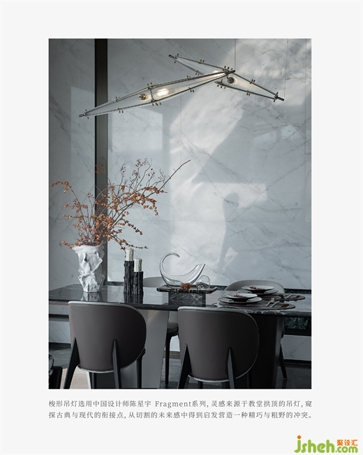大尺度的天然石材氛圍鋪陳了空間的紋理,通透而舒展;梭形吊燈相互交融的玻璃與光線,