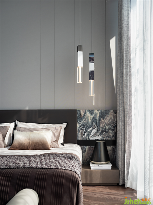簾影斑駁,搖曳生輝,沒有過多的色彩渲染,營造一種更為寧靜的柔和氛圍。床背的自然肌理與床品、藝術(shù)吊燈相呼應(yīng),平衡主臥空間的同時(shí),于細(xì)節(jié)處增加主臥空間的質(zhì)感。