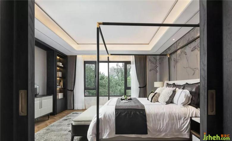 在老人房的處理上,窗前的遠(yuǎn)山景色被凝練于高低錯(cuò)落的屏風(fēng)之上,青松盆景、墻上金屬葉片自然的元素與生活的崇高詩意在此融為一體。
