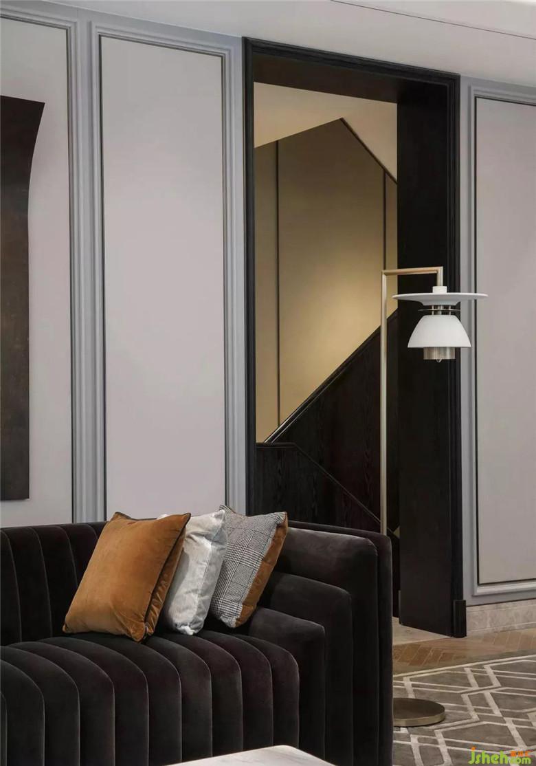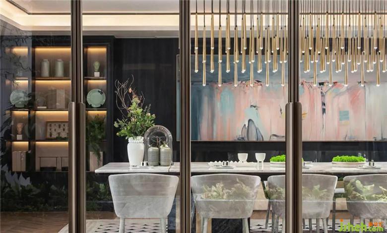 與書房區(qū)不同,線條的呈現(xiàn)方式,在女主人的下午茶空間變得溫柔了許多。從地毯的扇形拼接、線型吊燈的錯落秩序,到座椅的優(yōu)雅姿態(tài),將當代東方女性的韻味淋漓展現(xiàn)。