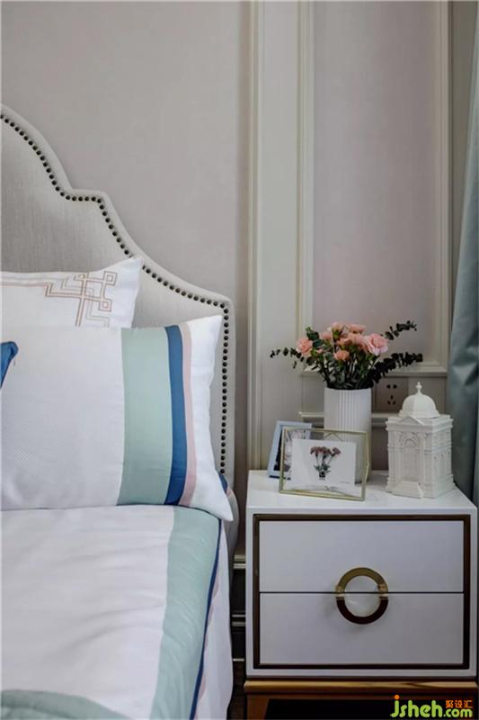 主臥整的設(shè)計(jì)采用米色護(hù)墻板及大面積灰綠色,讓整體空間時(shí)尚。主臥相對(duì)是主人的私密空間,即便如此也沒有被設(shè)計(jì)成封閉的區(qū)域,相反巧妙運(yùn)用了玻璃打造整個(gè)家的通透感,以靈活的簾子作為遮光或暫時(shí)阻斷視線之用。地面采用木地板,增添臥室的暖意,壁畫擺件再次呼應(yīng)整體空間的用色風(fēng)格。