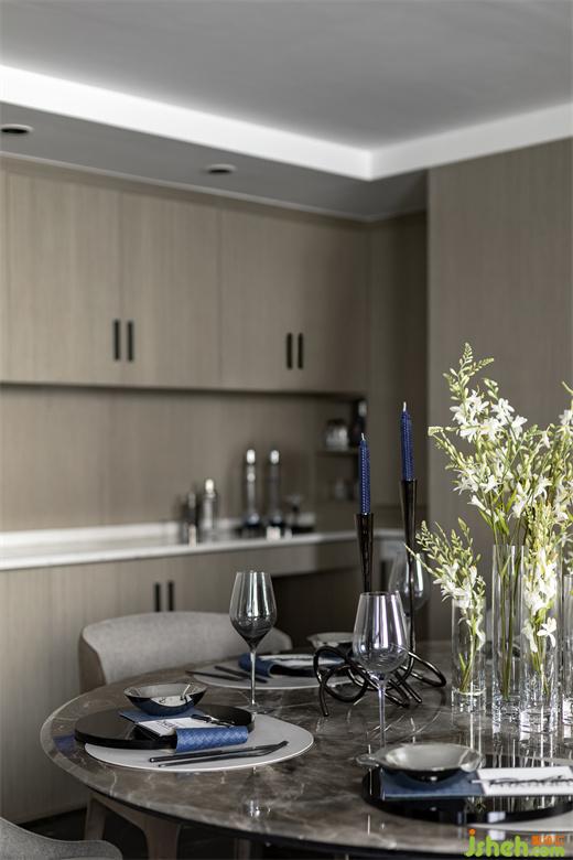 樣板房設(shè)計(jì)師利用社交群體記憶與空間的關(guān)聯(lián)轉(zhuǎn)化,建立起新的空間體驗(yàn)感,大膽利用黑色突出空間的嚴(yán)肅感,淺咖色系調(diào)整空間溫度感,用寶藍(lán)色增添空間活躍性,使人們對熟知的實(shí)物產(chǎn)生新的興奮感和舒適感,連接生活與藝術(shù),商務(wù)與圈層,打造屬于精英圈層的精神場域。