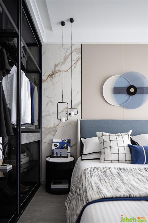 主臥空間以簡約的設(shè)計(jì)手法描繪出了純粹低雅的生活情境,高級灰作為主色調(diào)引導(dǎo)空間情緒,深灰色基調(diào)的儲衣柜,科學(xué)的內(nèi)部尺寸結(jié)構(gòu)是功能和藝術(shù)的完美結(jié)合,是精致與品質(zhì)生活的體現(xiàn),克萊因藍(lán)的軟裝陳設(shè)點(diǎn)綴其中,整個空間散發(fā)出細(xì)膩的層次感。
