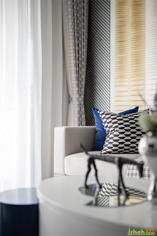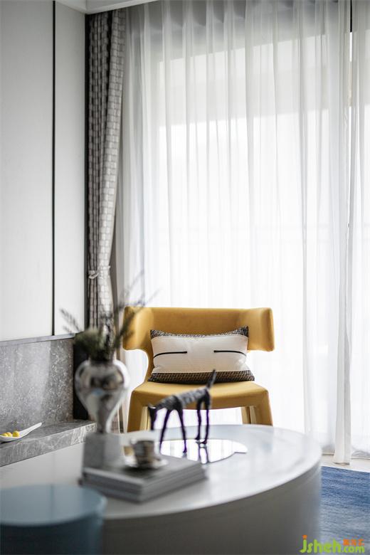 高級灰的色調(diào)也延續(xù)到了次臥,線條元素貫穿整個空間的設(shè)計(jì),陽光透過潔白的紗簾,樣板間設(shè)計(jì)處處散發(fā)出溫馨治愈的氛圍,諾大的空間被一抹藍(lán)點(diǎn)亮,在這樣慵懶和諧的空間中,舒適感被無限放大。