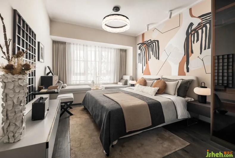 主臥運(yùn)用畫面線條的背景墻來延續(xù)空間的氣質(zhì),在張力十足的線條勾勒、樣板房設(shè)計(jì)層次豐富的材質(zhì)運(yùn)用以及極具質(zhì)感的裝飾細(xì)節(jié)下,不追求浮夸矯飾,構(gòu)造出一種樸素的精致及至精神張力的場(chǎng)域境界,光影變幻,重重悉見,動(dòng)靜之間,風(fēng)格渾然