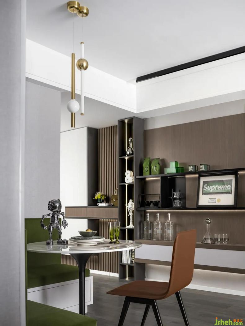 B戶型的設(shè)計(jì)通過模擬潮玩者每天每個(gè)時(shí)段的生活狀態(tài),以及所匹配到的空間氛圍,貫穿整套戶型的軟裝邏輯線索。整個(gè)空間在雅灰的鋪敘下,綠意的渲染中,皮革材質(zhì)的應(yīng)用以及深淺色彩的對(duì)比,增加了更多的空間品質(zhì)細(xì)節(jié)。舒適的皮質(zhì)主沙發(fā)配備大理石紋理的造型玻璃茶幾,多元肌理的木質(zhì)墻上放置最鐘愛的手辦和潮玩書籍。精準(zhǔn)的比例把控和寧?kù)o理智的色系搭配,樣板房設(shè)計(jì)彰顯主人個(gè)性的同時(shí)展露出對(duì)品質(zhì)與格調(diào)的不懈追求,讓人身處起居空間松放情緒,療愈煩。