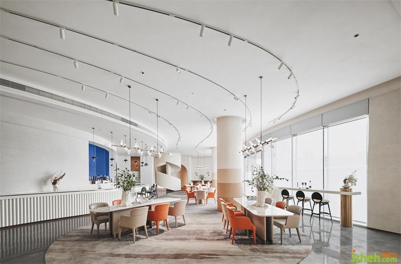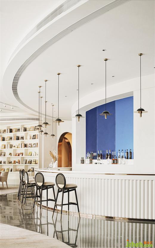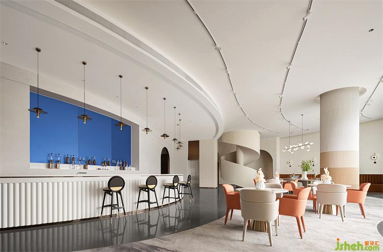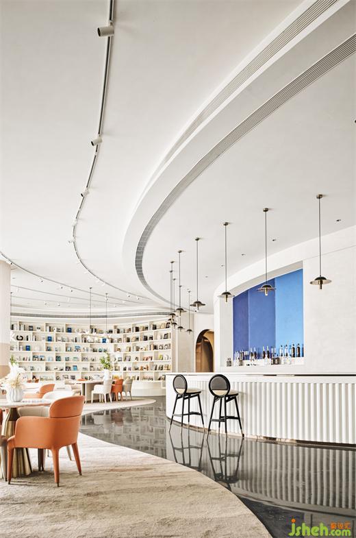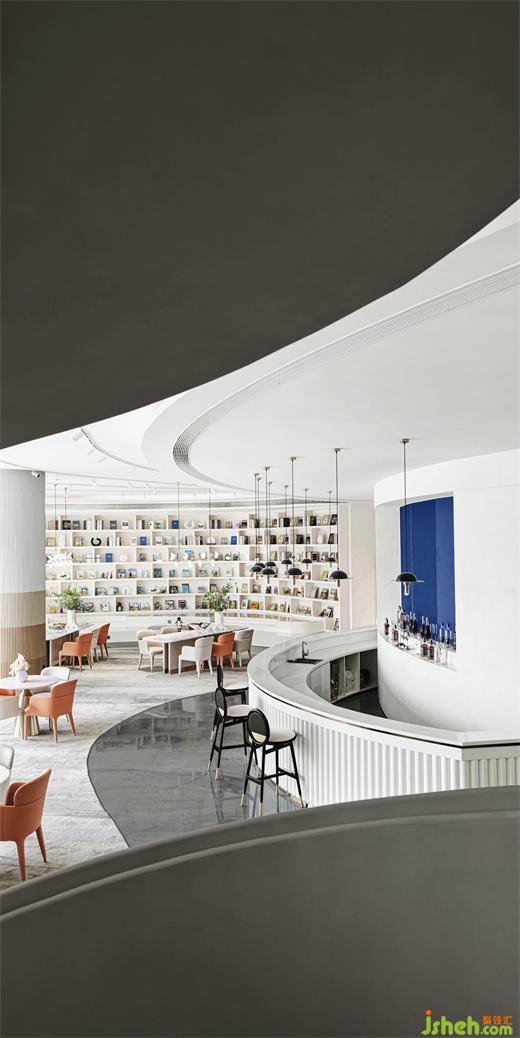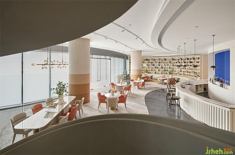 在負一樓清吧區(qū)域,色彩會更加的年輕活躍。隨意可落座的蜿蜒階梯書吧,配合不同形式的洽談桌椅,營造出豐富的空間層次,充滿質(zhì)感的皮革,純凈的花藝與綠植,在開闊的空間內(nèi)形成平衡量感,充滿自然與現(xiàn)代文明的和諧秩序之美。