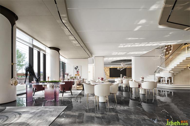 空間布局隨著建筑塑造的形態(tài)而展開,結(jié)合功能與需求,空間設(shè)計(jì)充分利用玻璃幕墻,對(duì)室外景觀不做任何遮擋,塑造人與自然、光景、與室內(nèi)的關(guān)聯(lián)互動(dòng)。