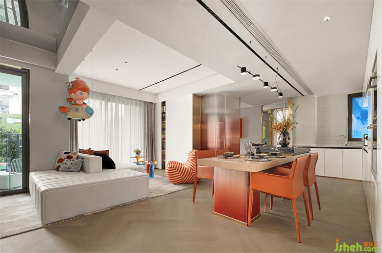 樣板間設(shè)計(jì)開(kāi)放的廚房,讓需要長(zhǎng)時(shí)間待在餐廳的人,不被空間所割離,讓任何活動(dòng)是能被看到,能被關(guān)注到的,同時(shí),隨時(shí)的互動(dòng)可能也讓交流更暢快,陪伴更輕松。家的關(guān)系因空間更為融洽合理。