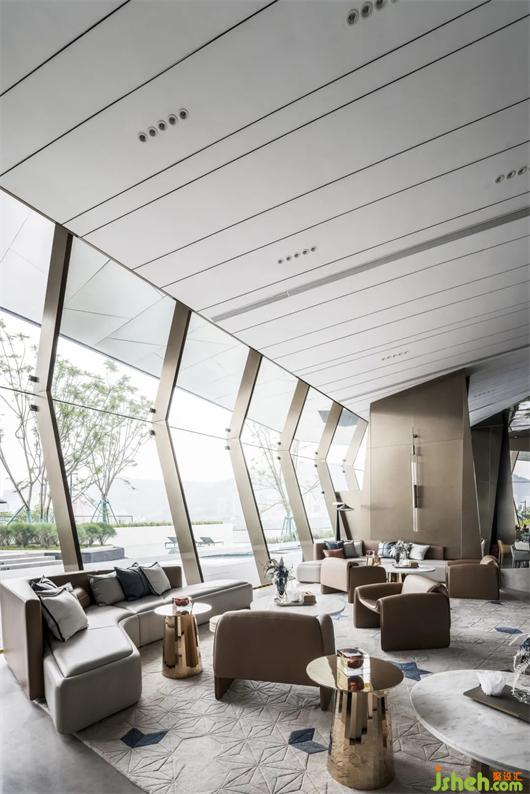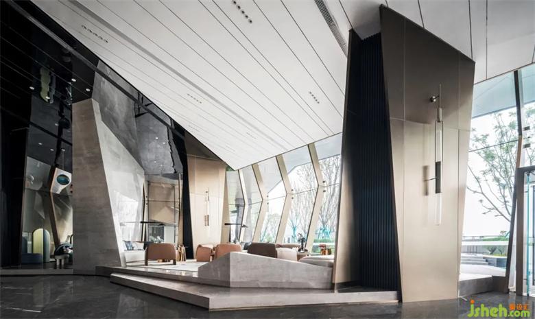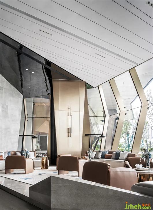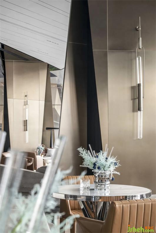 建筑大師賴特曾說,建筑是用結(jié)構(gòu)來表達思想的科學性的藝術(shù)??臻g體塊與線條穿插呼應(yīng),以解構(gòu)主義風格斜刺出挑,聚攏成突破性的視覺焦點,為空間內(nèi)寶石切面質(zhì)感的引入,搭建出“舞臺背景”。