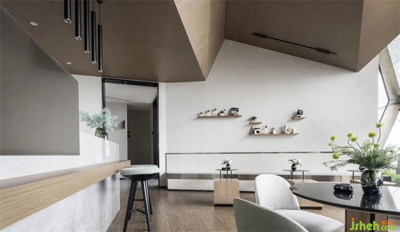 大面積的玻璃落地窗,讓自然光線進入,若即若離的景色變化以及戲劇性的情感體驗,激發(fā)訪者的想象情境;在樹影點光的映射下,置身于弧形洽談區(qū)之中,仿如被空間包裹著。在弱化空間界限性的同時,希望訪者憑借內(nèi)心的回憶為空間添上顏色。