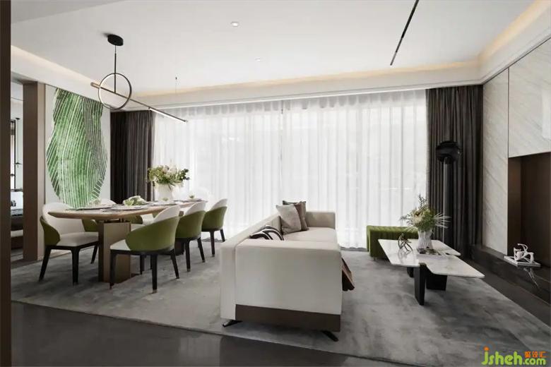 該作品以簡潔、純粹現(xiàn)代都市生態(tài)風(fēng)格為主打。樣板房設(shè)計(jì)將當(dāng)代的設(shè)計(jì)語言寄托于“自然”之間,藉由設(shè)計(jì)的手法將內(nèi)外相連,“棲居之所”便是棲居于草木之邊,被綠色環(huán)繞,令人感受到自然為伍是最珍貴的享受……