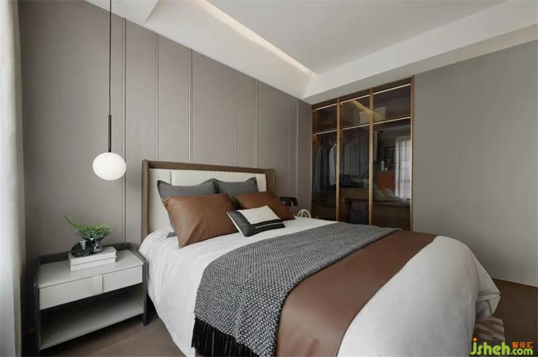 回歸最本質的功能需求,次臥中運用簡凈的皮革灰色組合,營造出恬淡雅靜的空間調性。樣板房設計在物質極大豐富的時代,或許更應該跳出空間形式與風格的桎梏,以更細微的觸角去洞察需求,眺望更理想的空間狀態(tài)。