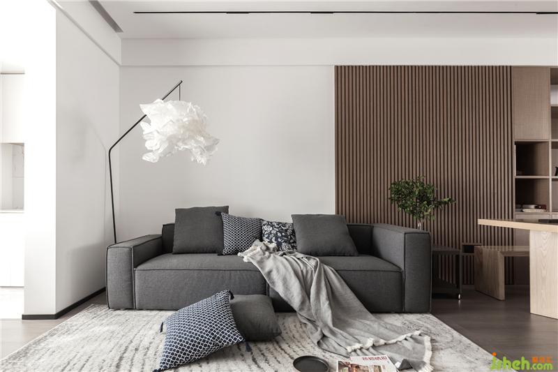 以木柵格板為背景的開放式客廳之中,四面皆可坐的沙發(fā)成為客廳的中心,形成一個環(huán)繞式動線,黑白灰之中舒適的卡其色是家中的主色調(diào),簡單而不平庸。