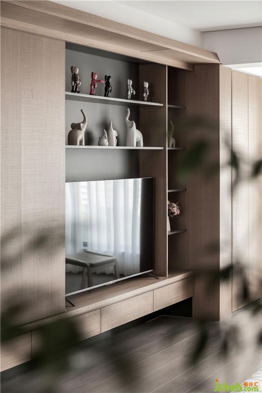 懸空的電視背景墻很好地平衡了進門視線的穿透性與私密性,同時下方的整排抽屜柜讓鏤空的臺面得以保持整潔廈門室內(nèi)設(shè)計。