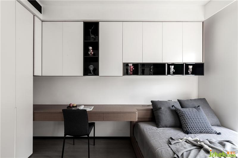 次臥室純白空間是小孩的房間,床貼柜的形式讓桌后空間更加寬裕,衣服存放、書本收納,看書寫作業(yè),休閑玩?!?統(tǒng)統(tǒng)滿足。