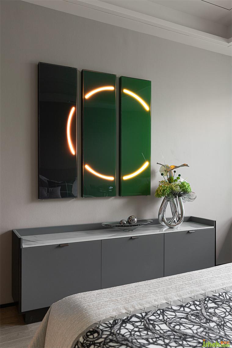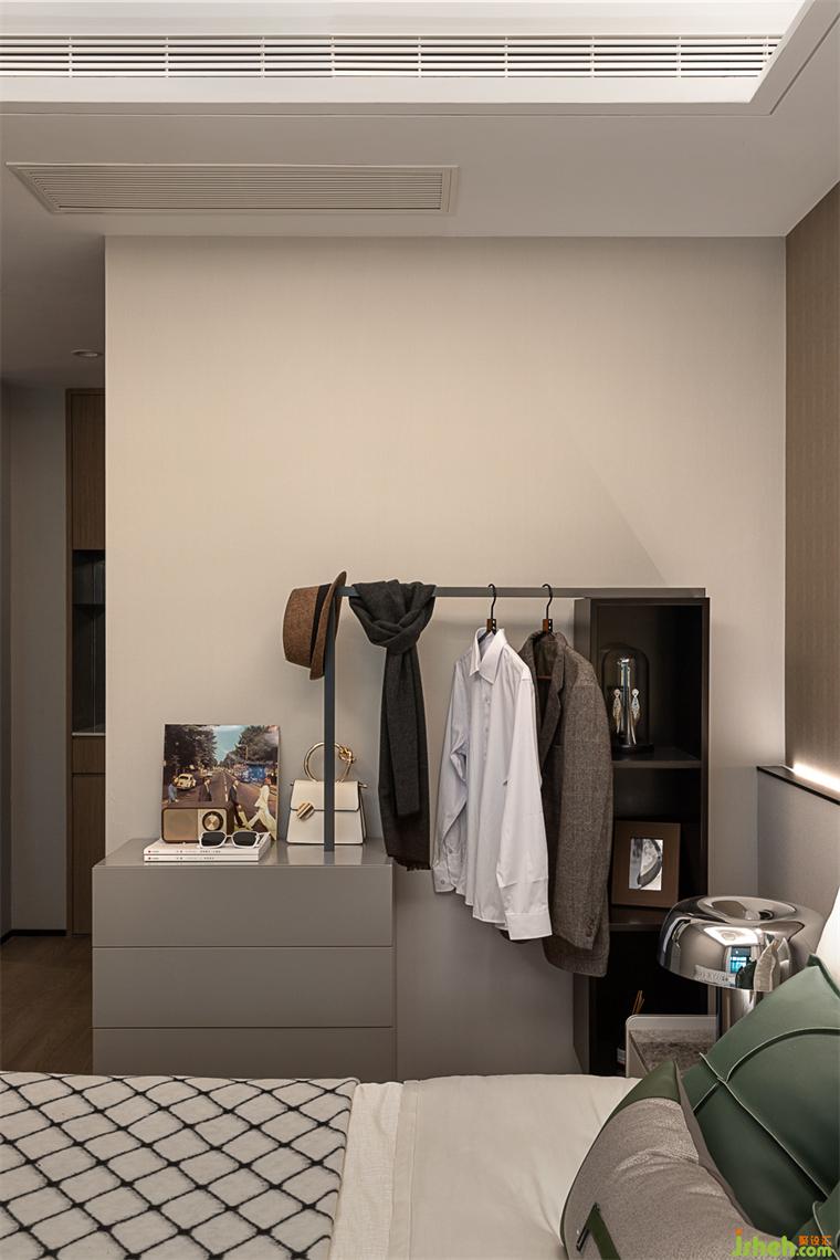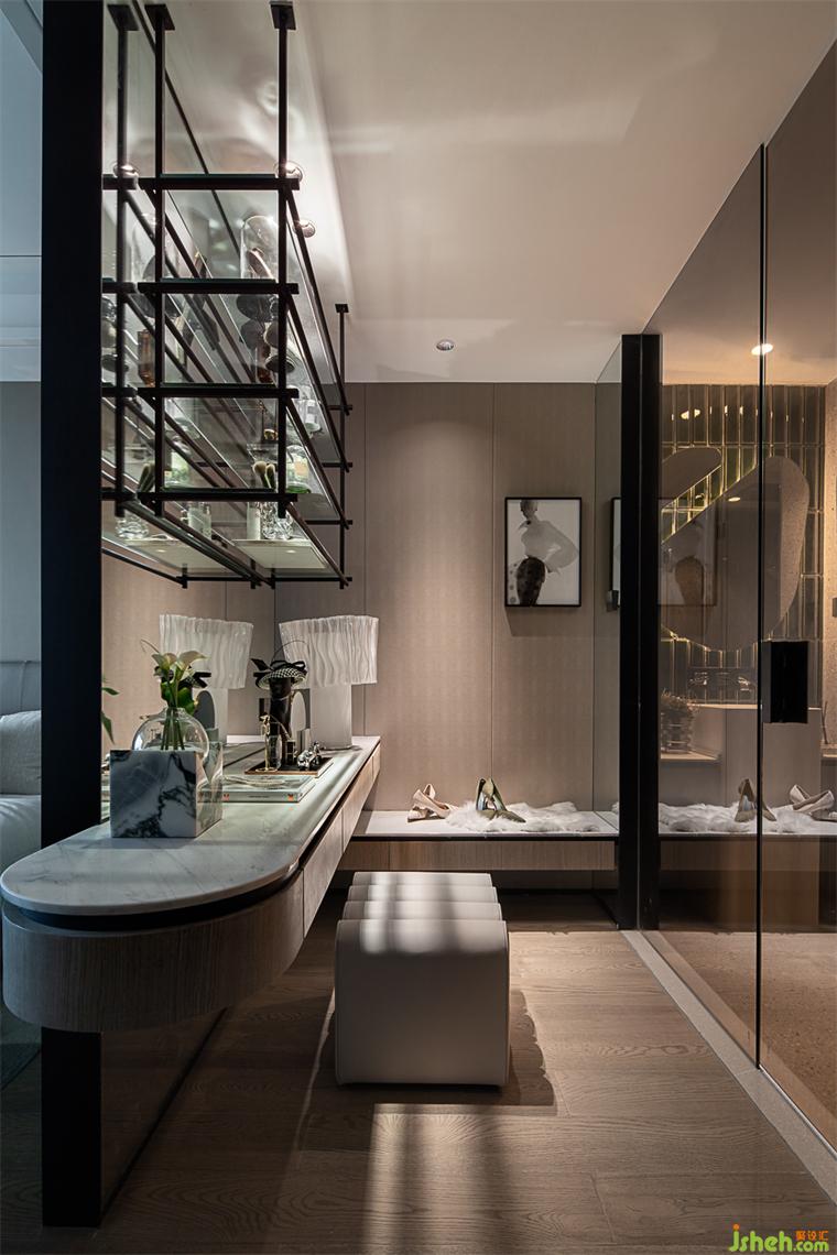 人在空間中的情感交流與活動狀態(tài),是豐富空間畫面的重要介質(zhì),樣板房設(shè)計獨立式的衣帽間,解決了大部分衣物和物品收納問題,形成區(qū)域間的獨立性與私密性,同時預(yù)留了化妝臺位置供平時使用。