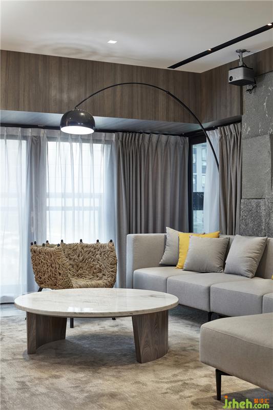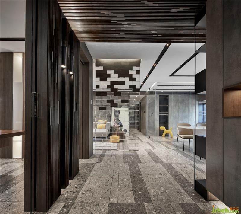 顏色材質(zhì)感知:整體空間大面積以灰、咖為主色調(diào),運(yùn)用了黃色作為輔助色系,局部的跳色點(diǎn)綴空間豐富空間色彩層次,提升空間的靈動(dòng)性