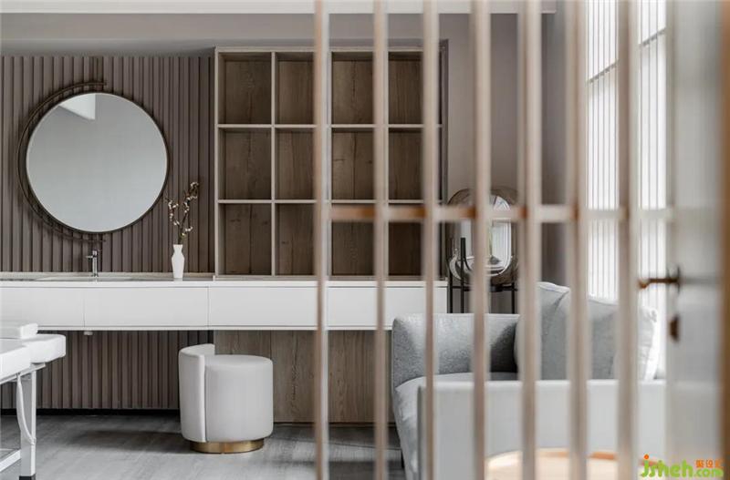 VIP室同樣延續(xù)了整體空間的材料質(zhì)感,同時(shí)用體塊化的手法處理臺(tái)盆、衣柜與儲(chǔ)物柜的關(guān)系,使其達(dá)到視覺(jué)上的平衡。