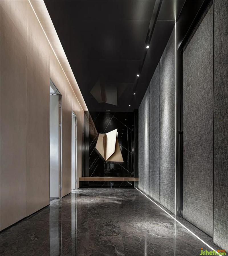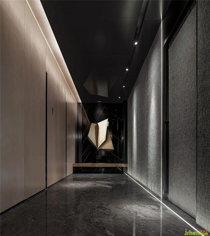 不銹鋼的天花、不規(guī)則的掛飾、不平滑的墻面,粗糲斑駁的大理石,過(guò)道空間同樣點(diǎn)題。細(xì)長(zhǎng)的地?zé)魺魩缤窐?biāo),延展指引到另一重截然不同的空間。