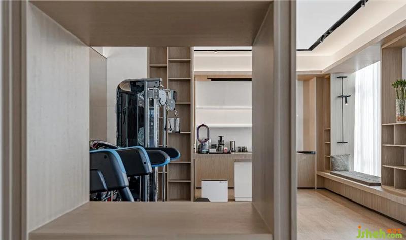 下層的健身房書吧采用大量的木飾面和白色大理石作為色彩基調(diào),顯得舒緩、溫馨而且明亮。沿著動(dòng)靜結(jié)合的思路,以空間盡頭的Mini餐吧為中軸,運(yùn)動(dòng)區(qū)和閱讀區(qū)平分秋色,創(chuàng)造一個(gè)滿滿人氣的放松好去處。