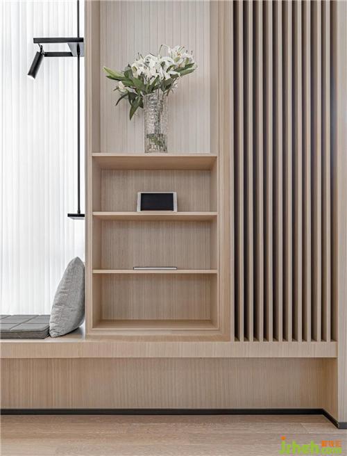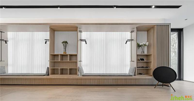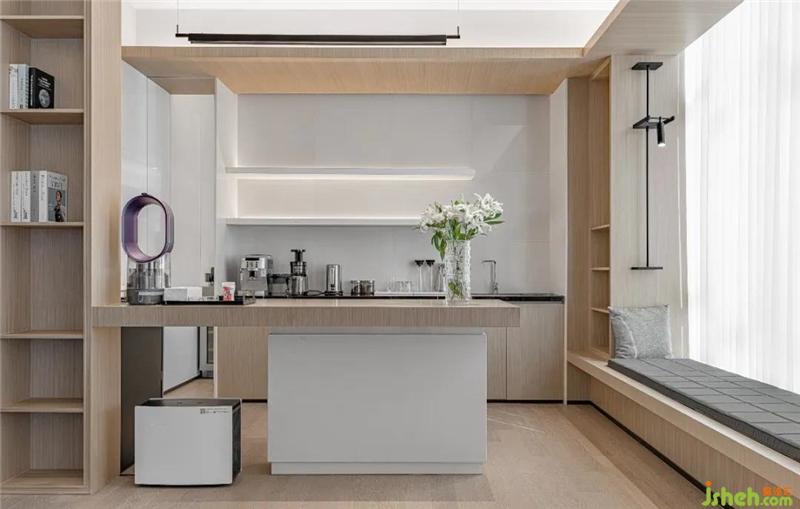 臨窗的咖啡休閑區(qū)依傍著餐吧,經(jīng)溫潤(rùn)的木飾面柜體虛實(shí)裝飾,展示出渾然一體的完整性。錯(cuò)落的收納空間,連貫著可容納多人的閱讀窗臺(tái),產(chǎn)生了相當(dāng)有趣且實(shí)用的立面韻律,不露痕跡地強(qiáng)調(diào)了功能分區(qū)。