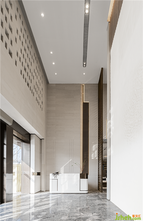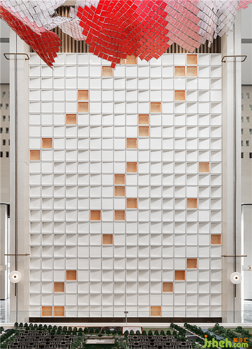 墻面藝術(shù)裝置則從Marcello Morandini的藝術(shù)作品演變而來,由明至暗,在方格間對光影進(jìn)行剪裁,運(yùn)用自然光線的明暗關(guān)系層層遞進(jìn),視覺上呈現(xiàn)出“看花非花,看花是花”的韻律感。在墻面的縱橫方格間,使光線如水波一般流動,盡顯柔和朦朧的美感。