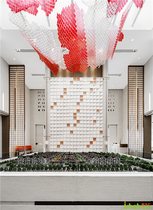 沙盤上方的藝術(shù)裝置,造型似鳳翅,如揚(yáng)起光輝的太陽,以傾身飛翔之態(tài),扶搖直上。紅白雙色映襯間,與傳統(tǒng)的丹鳳朝陽元素遙相呼應(yīng)。皎若旭日,軒然霞舉。