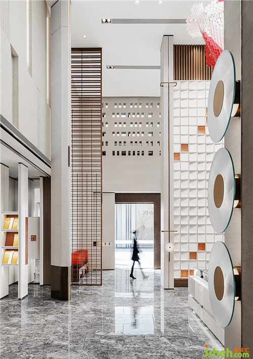 接待序廳采用開敞式空間,以對稱美感,致敬中國禮序思想;大面積米灰色系石材中穿插棱角分明的鏤空不銹鋼,北京售樓處設(shè)計(jì)銅質(zhì)壁燈點(diǎn)亮空間,定制故宮紅藝術(shù)裝置,硬朗的線條點(diǎn)綴柔和而端雅的宮燈紅,仿佛是在與時間對話,無言訴說前世今生的承續(xù)。