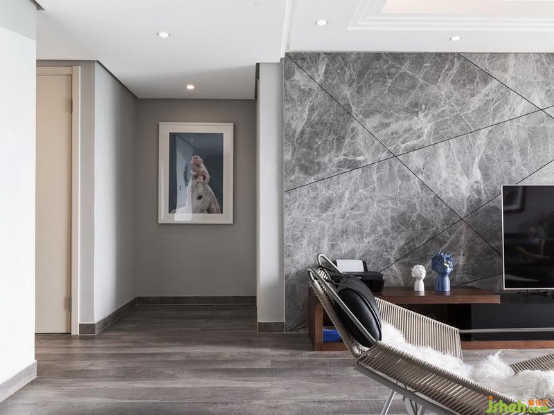 為了避免陷入‘流行色’主義俗套,我們室內設計師選用了“高級灰”經典色系進行組合搭配?;疑炯y磚、淺色地毯、白色大理石桌面的茶幾、爵士灰大理石的電視背景墻,自然紋理與工藝之美結合。