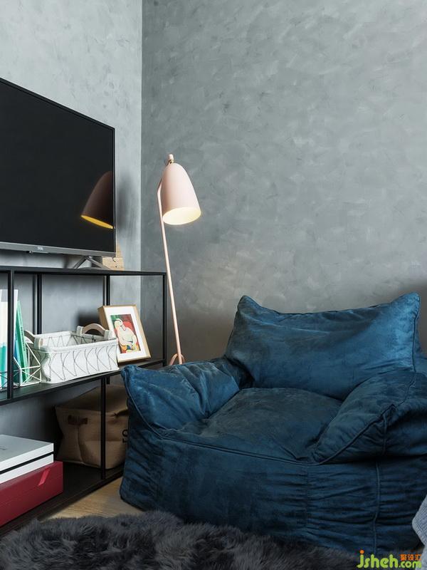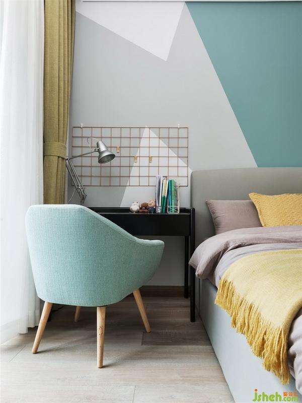 次臥背景墻用幾何色塊打破單調(diào)氛圍,床品依舊是香芋色為主,點(diǎn)綴黃色。