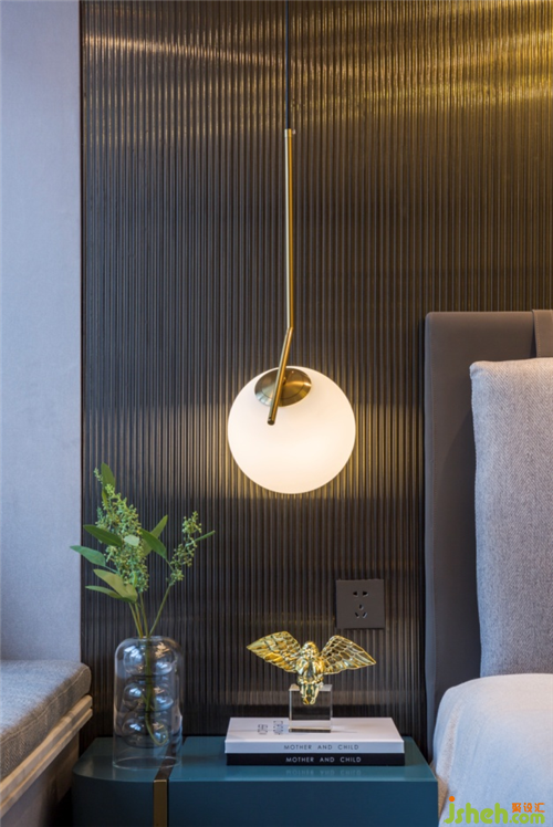 主臥延續(xù)了客廳的氛圍,整體深色的背景墻和灰色的地板,則能襯托出床鋪的簡潔輕奢感。黃銅的元素和灰色的布藝體現(xiàn)出了居住者對生活的熱愛和對品質(zhì)的追求。