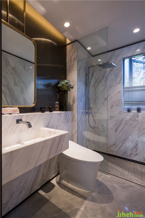 墻面與地面分別采用了灰色、白色的大理石,讓衛(wèi)生間明亮而簡(jiǎn)潔,懸吊的鏡面與一體化的臺(tái)盆凸顯簡(jiǎn)約低調(diào)的質(zhì)感美。