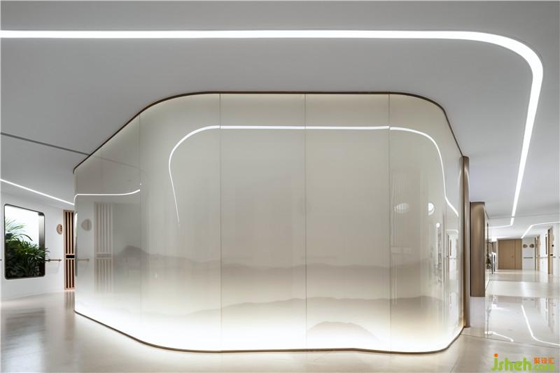 中央區(qū)域設計師沒有用傳統(tǒng)式實墻作為隔斷,而是以半透明的玻璃隔斷,賦以山水之墨,大氣磅礴。一方面使空間更加通透,打破實墻的壓抑感,另一方面又以山水之態(tài)氤氳空間氛圍,空靈而自然。