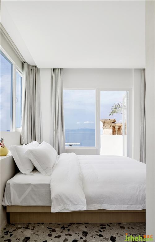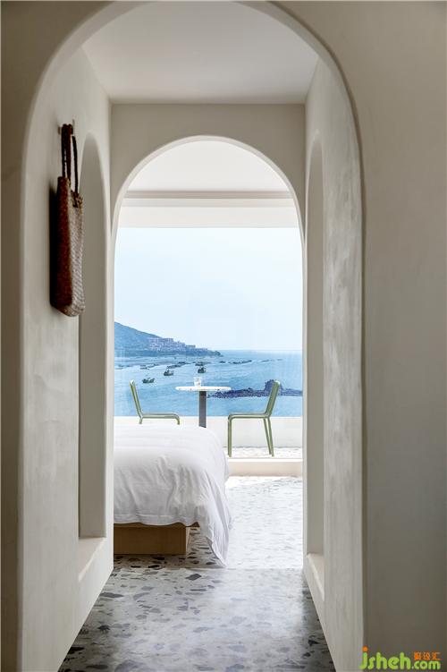 空間最大限度地將室外風(fēng)景引入室內(nèi),客房的每扇窗戶都被精心安排,朝向最美的視角開(kāi)設(shè),為來(lái)客細(xì)細(xì)收集這里的每一刻光景。透過(guò)細(xì)框落地窗遠(yuǎn)眺出去,清藍(lán)的海與山成了一幅框景,日出的璨斕、海浪的長(zhǎng)歌、晚霞的溫柔……空間將流動(dòng)而纏綿的自然詩(shī)意納入日常之中,予人安適舒愜之感。酒店設(shè)計(jì)
