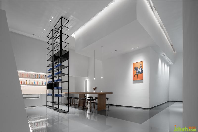 層高3.8米的線條感隔柵與垂直投射的陣列型吊燈相互映襯,演繹出摩登的當代設(shè)計美學。深度洽談區(qū)的長桌延伸至吧臺展示柜,體塊的交疊穿插塑造著獨特的雕塑感與戲劇趣味。